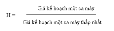 + Trường hợp không theo dõi tập hợp chi phí cho từng loại máy riêng biệt, phải xác định ca máy tiêu chuẩn thông qua hệ số quy đổi. Hệ số quy đổi thường được xác định căn cứ vào đơn giá kế hoạch. Giá kế hoạch của 1 ca máy thấp nhất được lấy làm ca máy chuẩn. Xác định hệ số quy đổi H như sau: