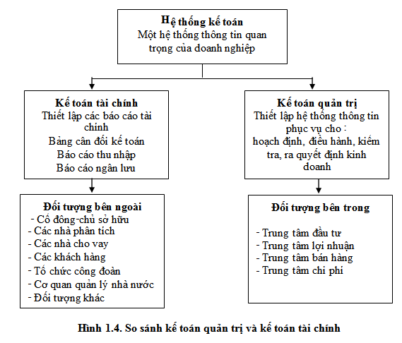 Theo Nguyễn Tấn Bình (2005), kế toán quản trị là một khoa học quản lý dựa trên cơ sở dữ liệu của kế toán tài chính, nó thu thập, xử lý, phân tích, tổng hợp và thiết kế những thông tin từ kế toán thành những thông tin hữu ích một cách hệ thống, phục vụ cho các quyết định quản trị doanh nghiệp trong sách lược kinh doanh ngắn hạn và chiến lược đầu tư dài hạn của doanh nghiệp. Nói cách khác, mục đích của kế toán quản trị là phục vụ công việc quản trị và điều hành hoạt động kinh doanh của doanh nghiệp. Mối quan hệ so sánh giữa hệ thống kế toán quản trị và hệ thống kế toán tài chính được thể hiện trong hình 1.4 dưới đây.